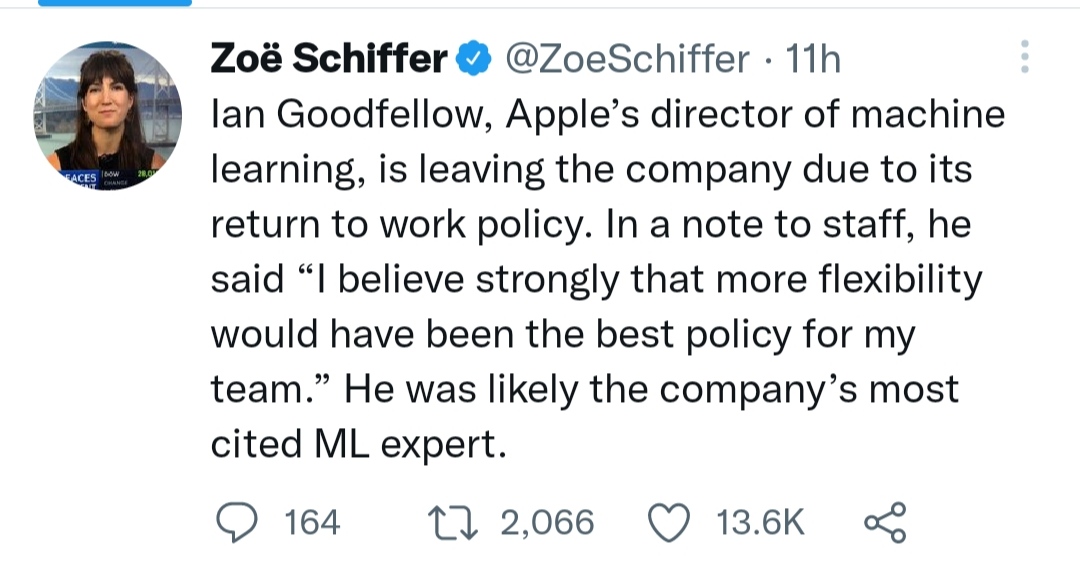 به نقل از توئیت Zoë Schiffer یکی از اعضا سایت خبری The Verge، مدیر بخش مهم، یادگیری ماشین کمپانی بزرگ اپل که ایان گودفلو نام داشت از سمت خود استعفا داده است. او قبلا یکی از برترین کارمندان بخش هوش مصنوعی گوگل بود و در سال 2019 در اپل مشغول به کار شده بود.