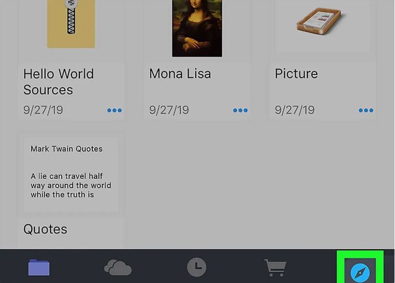اپلیکیشن Documents by Readdle را که در مرحله اول نصب شد، اجرا کنید و روی آیکون سمت راست و پایین صفحه ( طبق تصویر زیر ) کلیک کنید تا مرورگر داخلی اپلیکیشن اجرا شود.