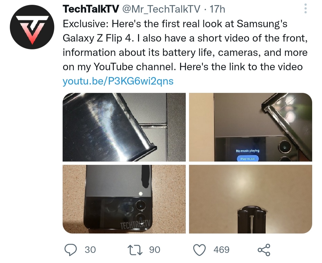 در شبکه اجتماعی توئیتر بهتازگی یک اکانت کاربری با نام Mr_TechTalkTV@، تصاویر واقعی گلکسی زد فلیپ ۴ با رنگ خاکستری را به اشتراک گذاشته است. این گوشی با طراحی شبیه به نسل قبل و اندازه صفحهنمایش داخلی همان ۶٫۷ اینچ خواهد بود. اما در وسط صفحهنمایش مانند نسل قبل تاخوردگی وجود نخواهد داشت و سامسونگ تمام سعی خود را کرده تا صفحهنمایش یکپارچهتری را برای فلیپ ۴ بسازد. همچنین حاشیههای صفحهنمایش کمی کاهش پیدا کرده و گلکسی زد فلیپ ۴ لولای باریکتری دارد، اما فاصله میان صفحهنمایش در زمان بسته بودن گوشی، همچنان مانند مدل قبل وجود دارد.