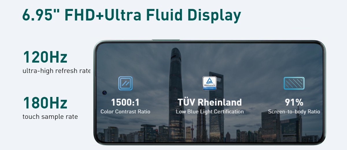 در پنل جلویی گوشی شاهد یک صفحهنمایش بزرگ 6.95 اینچی از نوع IPS LCD هستیم که از وضوح تصویر 2460 × 1080 پیکسل و تراکم پیکسل 387 پیکسل بر اینچ بهره میبرد.