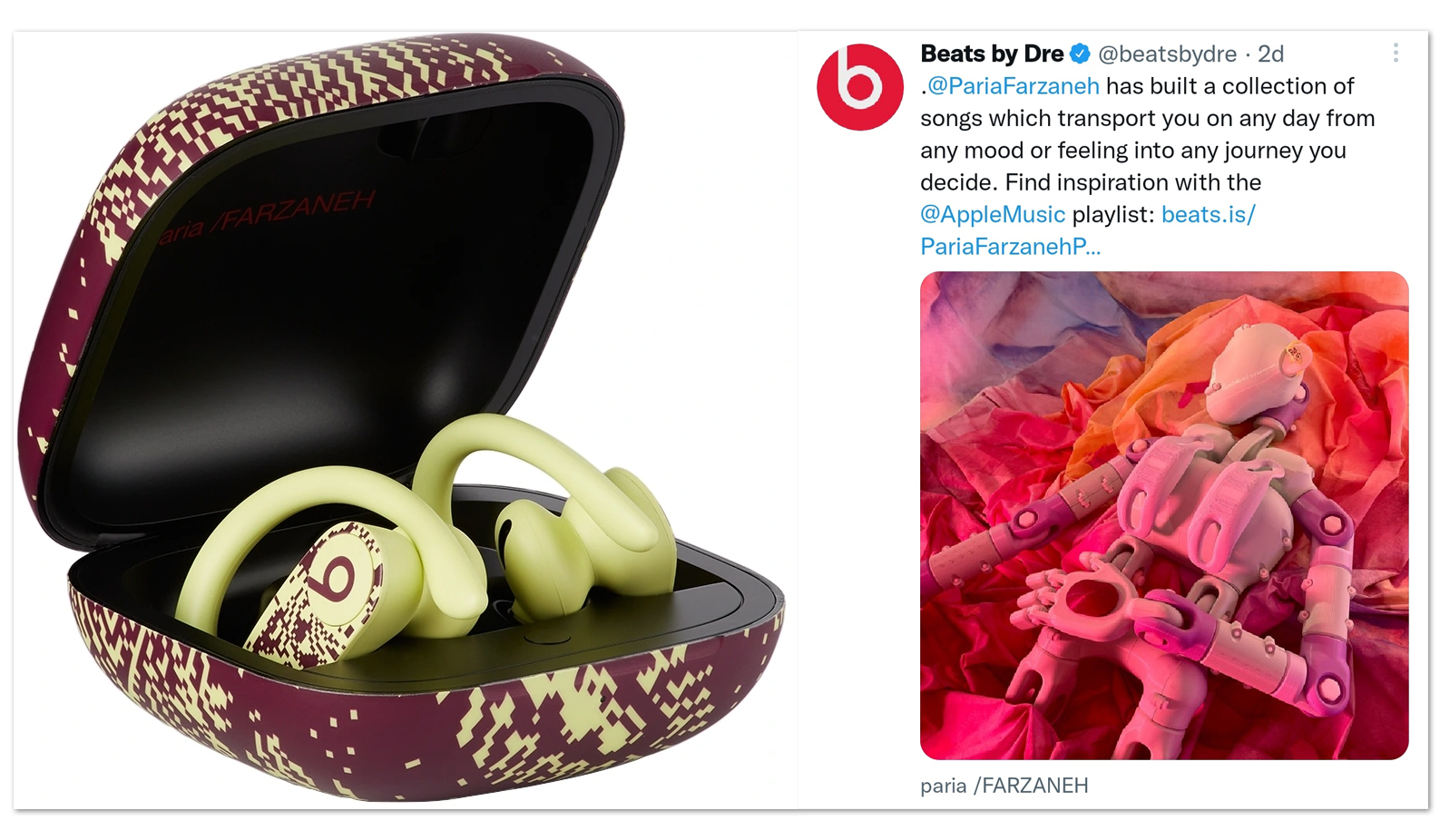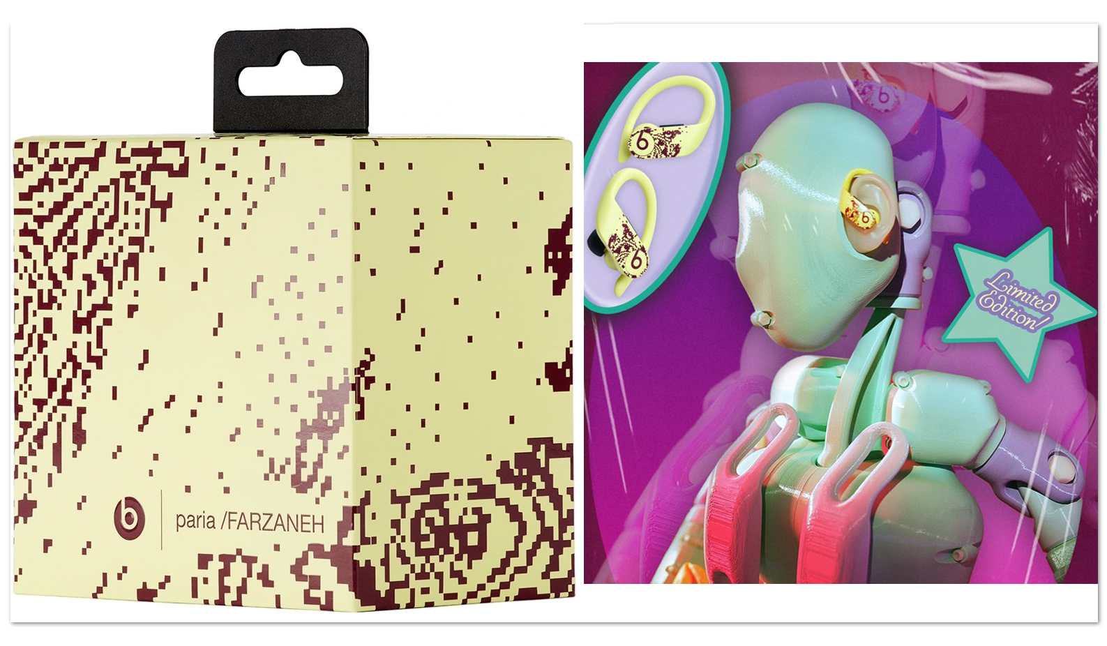 اپل با پریا فرزانه طراح مد انگلیسی-ایرانی مقیم لندن، برای طراحی نسخه ویژه هدفون پاور بیتس پرو همکاری کرده است. شرکت بیتس زیرمجموعه اپل است که نسخه هدفون پاور بیتس NBA را در ماه فوریه معرفی کرد، اکنون این شرکت نسخه ویژه دیگری از هدفونهای بی سیم خود با طراحی پریا فرزانه را ارائه کرده است. محصول نهایی طراحی زرد و بنفش دارد و سبک منحصر به فرد طراحی را نشان میدهد. حساب رسمی توئیتر شرکت بیتس"beatsbydre@" به تازگی در توئیتی این موضوع را اعلام کرد.