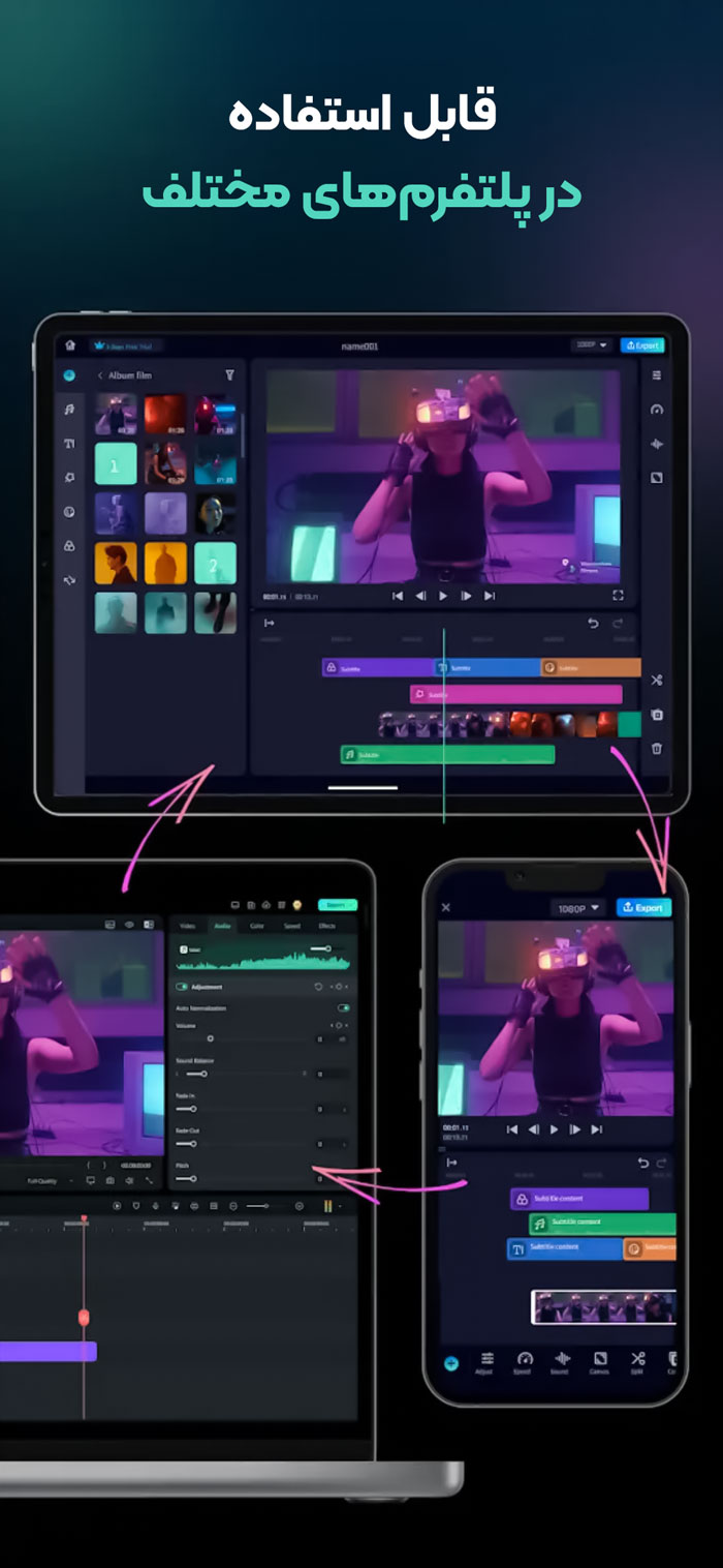 ساخت ویدیوی حرفهای برای اینستاگرام، تیک تاک و سایر پلتفرمها، سرگرمی یا اقتضای کار حرفهای افراد زیادی است. اپلیکیشن Filmora، یک ادیتور حرفهای ویدیو برای پلتفرمهای مختلف است که به شما امکان میدهد به سرعت و بدون پیچیدگی، ویدیوهای خود را ادیت کنید. همچنین، به کمک هوش مصنوعی و تمپلیتهای متنوع فیلمورا میتوانید یک یا چند عکس را به ویدیو تبدیل کنید. این اپلیکیشن حجم زیادی ندارد و برای استفاده از آن به یک دستگاه قوی نیاز ندارید. با این حال، بسیاری از امکانات برنامههای حرفهای مثل پریمیر، فاینال کات و ... که نیاز به سیستمهای پیشرفته دارند را در اختیار شما میگذارد. محیط کاربری فیلمورا ساده، اما حرفهای است. میتوانید از ترانزیشنهای مختلف استفاده کنید. سرعت ویدیو را تنظیم کنید. پرده سبز را حذف کنید. به ویدیو موسیقی اضافه یا حذف کنید و با استفاده از فونتها و استیکرهای تعاملی به آنها جان ببخشید. از دیگر امکانات اپلیکیشن فیلمورا میتوان به موارد زیر اشاره کرد: