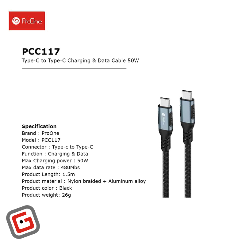 کابل شارژ 50 واتی Type-C پرووان مدل PCC117 به طول 1.5 متر