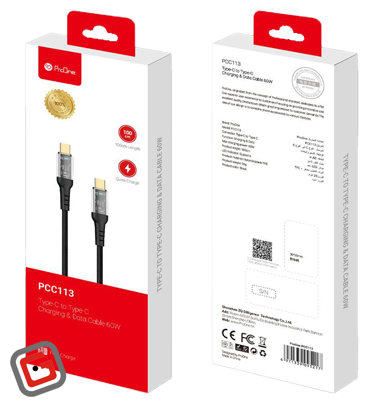 کابل شارژ 60 واتی Type-C پرووان مدل PCC113 به طول 1 متر