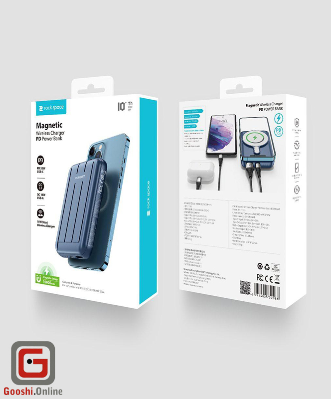 پاوربانک بی سیم و مغناطیسی 10000 میلی آمپر فست شارژ راک اسپیس مدل P99